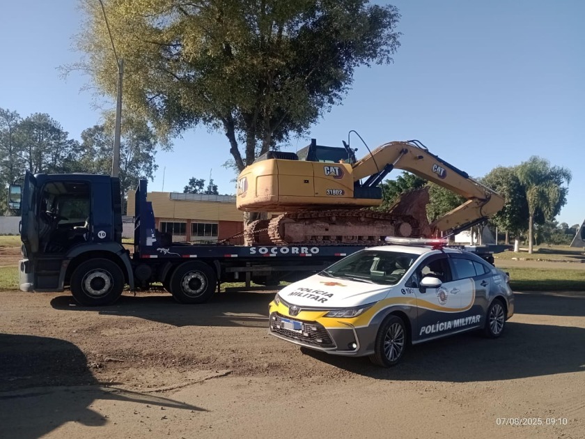 Rastreamento e informações junto à transportadora responsável, com sede em Minas Gerais, levaram à localização do veículo e da escavadeira em território paulista, com o apoio da PM-SP.